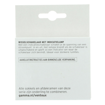 Met de GAMMA Ventoux Wisselschakelaar Wit met Indicatielamp kun je de spanning in- en uitschakelen. De schakelaar heeft een klein led-lampje dat brand wanneer het licht is uitgeschakeld. Deze schakelaar is ook te gebruiken in een hotelschakeling om vanaf twee verschillende plaatsen één lichtpunt te bedienen. Installatie van de schakelaar is eenvoudig met behulp van de handleiding en het aansluitschema.