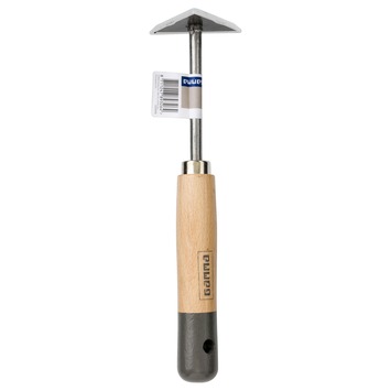 - Met een blank gehard stalen en schuin geslepen driehoekige kop met gelakt houten steel