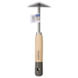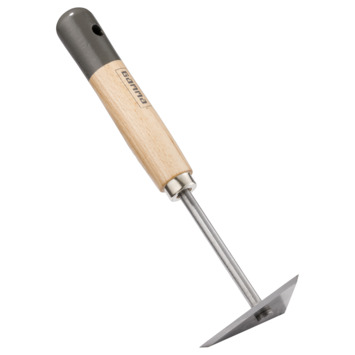 - Met een blank gehard stalen en schuin geslepen driehoekige kop met gelakt houten steel
