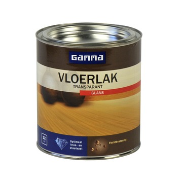 GAMMA vloerlak kleurloos hoogglans 750 ml is een kleurloze lak met poly urethaan versterkt. Hierdoor ontstaat een extra harde toplaag op hardhouten vloeren, en parket zodat deze intensief belast kunnen worden. Het is een transparant product waardoor de houtnerf zichtbaar blijft. Het product is oplosmiddelhoudend. Voor de eerste laag kan het product eventueel verdund worden met 5% terpentine . Het is na 4 uur stofdroog en na 18 uur overschilderbaar. Eén blik van 750 ml volstaat voor het lakken van een oppervlakte van 12 m2. GAMMA vloerlak kleurloos hoogglans is ook geschikt voor het beschermen van houten trappen.