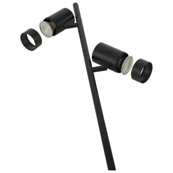 De vloerlamp Pepijn is een elegante vloerlamp met een formaat van 150 cm hoog, gemaakt van metaal in de kleur zwart. De vloerlamp is geschikt voor 2 lichtbronnen met een maximale wattage van 2x25 watt met een GU10 fitting. De lampen zijn richtbaar. De lamp wordt geleverd exclusief lichtbron.
