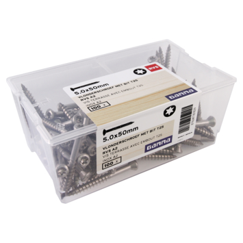 Deze vlonderschroef van GAMMA is gemaakt van roestvrij staal en dus prima geschikt voor toepassing buitenshuis. Vlonderschroeven zijn speciaal bedoeld om vlonderplaten vast te schroeven vanwege de deeldraad en de speciale T25 schroefkop met torx-aandrijving die mooi verzinkt in het hout. Met deze vlonderschroeven is het bijna uitgesloten dat het hout splijt. Voorboren is alleen nodig bij de kopse kanten. Vlonderschroeven heeft GAMMA in verschillende lengtes en verpakkingen. Deze schroeven hebben een afmeting van 5x50mm. Eén verpakking bevat 100 stuks vlonderschroeven.