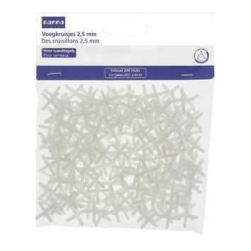 De tegelkruisjes 2,5mm 200st zijn van kunststof en hebben een dikte van 2,5mm. Steek deze kruisjes tussen de tegels voor een correcte uitlijning en regelmatige voegen. Bij deze maat wordt de breedte van de voeg 2,5mm. Inhoud 200 stuks