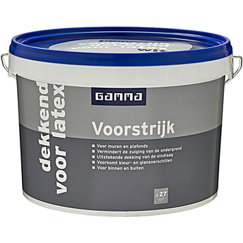 GAMMA voorstrijk dekkend voor latex wit 2,5 liter is een uitstekend dekkend voorbehandelingsmiddel voor droge ondergronden zoals schuur- en pleisterwerk en geschilderde muren. Het heft de zuiging op die in muren kan voorkomen. Hierdoor wordt het rendement van de eindlaag muurverf vergroot. Tevens voorkomt het eventuele glansverschillen in de afwerklaag. De voorstrijk is eenvoudig aan te brengen met een muurverfroller. Eén emmer van 2,5 liter volstaat voor het schilderen van een oppervlakte van 25 m2.