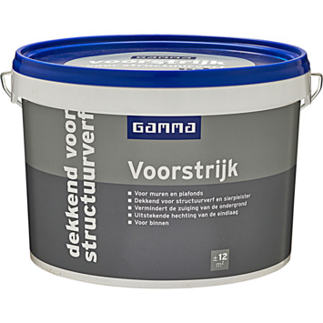 GAMMA voorstrijk dekkend voor structuurverf wit 2,5 liter is een uitstekend dekkend voorbehandelingsmiddel van droge ondergronden die als afdeklaag worden bewerkt met structuur- of korrelpleister. De voorstrijk is ook geschikt als voorbehandeling voor GAMMA structuurverf. Het zorgt dat de eindlaag uitstekend hecht en het vermindert de zuigende werking die in muren kan voorkomen. De voorstrijk is eenvoudig aan te brengen met een muurverfroller of blokkwast. Eén emmer van 2,5 liter volstaat voor het schilderen van een oppervlakte van 12,5 m2.