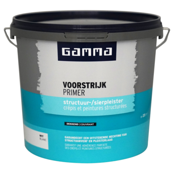 GAMMA voorstrijk structuur en sierpleister wit 5 liter is een dekkende voorstrijk / primer met een fijne structuur. Voor muren en plafonds die worden afgewerkt met structuurverf, structuurpleister of korrelpleister. Zorgt voor een uitstekende hechting van de eindlaag. Ook vermindert het de zuiging van de ondergrond. De watergedragen voorstrijk is sneldrogend. Voor binnengebruik.