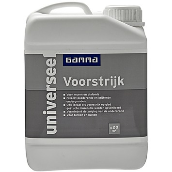 GAMMA voorstrijk universeel transparant 2,5 liter is een diepgrondlaag voor het vastzetten/fixeren van poederende en schilferende ondergronden. Het product is toepasbaar op droge oppervlakten zoals schuur- en pleisterwerk, beton en cement. De voorstrijk dringt diep in de ondergrond en zorgt voor een betere hechting van de afwerklaag. De voorstrijk is zowel binnenshuis als buitenshuis eenvoudig aan te brengen met een muurverfroller of een blokkwast. Een verpakking van 2,5 liter volstaat voor het schilderen van een oppervlakte van 15 tot 25 m2. GAMMA voorstrijk universeel vormt een prima basis voor het opknappen van verontreinigde oppervlakten op muren en plafonds.