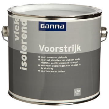 GAMMA voorstrijk vlek isolerend wit 2,5 liter is een witte isolerende grondlaag om doorslaande verontreinigingen, zoals nicotine, vocht en lijmresten, blijvend te bedekken. Hier zullen deze na het aanbrengen van de muurverf of sierpleister afdeklaag, niet meer doorslaan. De voorstrijk is zowel binnenshuis als buitenshuis eenvoudig aan te brengen met een muurverfroller of een blokkwast. Eén blik van 2,5 liter volstaat voor het schilderen van een oppervlakte van 15 m2. GAMMA voorstrijk vlek isolerend vormt een prima basis voor het opknappen van verontreinigde oppervlakten op muren en plafonds.