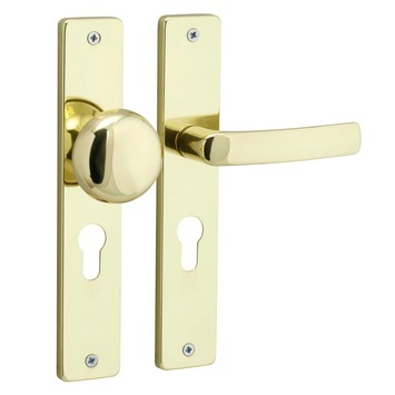 Voordeurbeslag messing knop/kruk 72 mm t.b.v. buitendeur met cilinderslot. Deze voordeurset heeft een vaste niet draaiende knop. En is voor zowel links als rechts draaiende deuren geschikt. De maat 72mm is na te meten door de afstand te meten tussen het hart van het deurrkukgat en de hart van het ronde deel van de cilindergat. Dit artikel maakt deel uit van het uitgebreide programma van voordeurbeslag en accessoires.