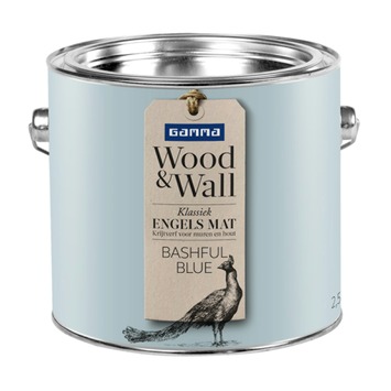 GAMMA Wood&Wall Klassiek Engels Mat in de kleur Bashful Blue 2,5 liter is een zeer matte krijtverf met een verfijnde uitstraling en een geheel eigen effect. Het poedermatte effect komt tot in de kleinste detail tot zijn recht. GAMMA Wood&Wall geeft uw huis de cottagesfeer van de Engelse countryside. De matte krijtverf is op acrylbasis en geschikt voor zowel binnenmuren als houten meubels. De matte krijtverf is afwasbaar, reukarm en niet vergelend. Naast de standaard beschikbare kleuren is deze verf ook te mengen in ieder gewenste kleur in de GAMMA bouwmarkt.