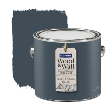 GAMMA Wood&Wall Klassiek Extra Mat in de kleur boulevard blue 2,5 liter is een zeer matte krijtverf met een verfijnde uitstraling en een geheel eigen effect. Het poedermatte effect komt tot in de kleinste detail tot zijn recht. GAMMA Wood&Wall geeft je huis de cottagesfeer van de Engelse countryside.