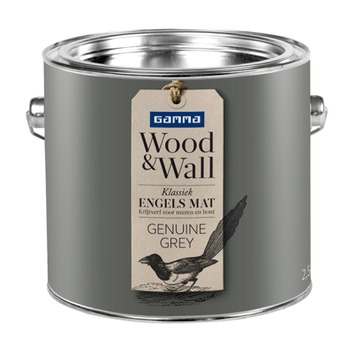 GAMMA Wood&Wall Klassiek Engels Mat in de kleur Genuine Grey 2,5 liter is een zeer matte krijtverf met een verfijnde uitstraling en een geheel eigen effect. Het poedermatte effect komt tot in de kleinste detail tot zijn recht. GAMMA Wood&Wall geeft uw huis de cottagesfeer van de Engelse countryside. De matte krijtverf is op acrylbasis en geschikt voor zowel binnenmuren als houten meubels. De matte krijtverf is afwasbaar, reukarm en niet vergelend. Naast de standaard beschikbare kleuren is deze verf ook te mengen in ieder gewenste kleur in de GAMMA bouwmarkt.