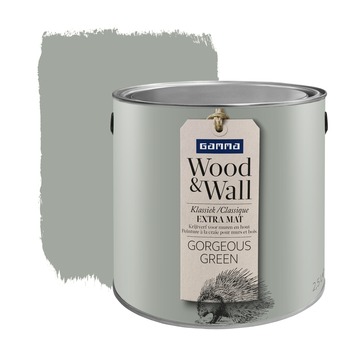 GAMMA Wood&Wall Klassiek Engels Mat in de kleur Gorgeous Green 2,5 liter is een zeer matte krijtverf met een verfijnde uitstraling en een geheel eigen effect. Het poedermatte effect komt tot in de kleinste detail tot zijn recht. GAMMA Wood&Wall geeft uw huis de cottagesfeer van de Engelse countryside. De matte krijtverf is op acrylbasis en geschikt voor zowel binnenmuren als houten meubels. De matte krijtverf is afwasbaar, reukarm en niet vergelend. Naast de standaard beschikbare kleuren is deze verf ook te mengen in ieder gewenste kleur in de GAMMA bouwmarkt.