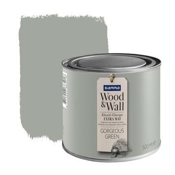 GAMMA Wood&Wall Klassiek Engels Mat in de kleur Gorgeous Green 500 ml is een zeer matte krijtverf met een verfijnde uitstraling en een geheel eigen effect. Het poedermatte effect komt tot in de kleinste detail tot zijn recht. GAMMA Wood&Wall geeft uw huis de cottagesfeer van de Engelse countryside. De matte krijtverf is op acrylbasis en geschikt voor zowel binnenmuren als houten meubels. De matte krijtverf is afwasbaar, reukarm en niet vergelend. Naast de standaard beschikbare kleuren is deze verf ook te mengen in ieder gewenste kleur in de GAMMA bouwmarkt.