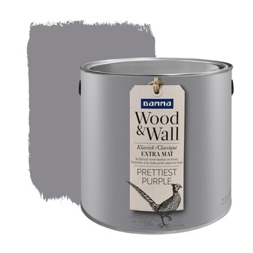 GAMMA Wood&Wall Klassiek Engels Mat in de kleur Prettiest Purple 2,5 liter is een zeer matte krijtverf met een verfijnde uitstraling en een geheel eigen effect. Het poedermatte effect komt tot in de kleinste detail tot zijn recht. GAMMA Wood&Wall geeft uw huis de cottagesfeer van de Engelse countryside. De matte krijtverf is op acrylbasis en geschikt voor zowel binnenmuren als houten meubels. De matte krijtverf is afwasbaar, reukarm en niet vergelend. Naast de standaard beschikbare kleuren is deze verf ook te mengen in ieder gewenste kleur in de GAMMA bouwmarkt.