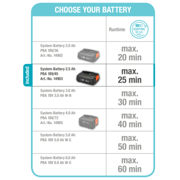 - 'Power for All' 18V accuplatform, waarbij 1 accu toepasbaar is op het gereedschap uit het 'power for all' accuplatform van Gardena, maar ook o.a. Bosch en Gloria