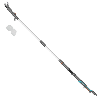 De Accu-telescooptakkenschaar HighCut 250/18V P4A solo van GARDENA helpt je gemakkelijk op grote hoogten te snoeien vanaf de grond. De takkenschaar heeft een maximale lengte van 2,5 meter, waardoor je in totaal wel 4 meter hoog kan snoeien. Dankzij de afneembare steel is de HighCut gemakkelijk te vervoeren en bewaren. De POWER FOR ALL-accu zorgt voor gemakkelijke sneden zonder dat je veel kracht hoeft te zetten. De originele GARDENA-messen zijn gemaakt in Duitsland van gehard staal en zorgen voor een nette snede in vers hout tot wel 28 mm in diameter. Ze hebben een antikleeflaag en zijn precisiegeslepen, zodat geknipt materiaal niet aan het mes blijft plakken. Gebruik de kantelende en smalle schaarkop om afzonderlijke takken te knippen, met een hoek van 60 graden. De gekantelde kop geeft je bovendien een goed zicht op wat je aan het doen bent. Als takken blijven hangen in de boom kan je ze gemakkelijk omlaag trekken, met de haak bovenop het handvat. Je kan de laadstatus van de accu zien op de ledindicator in de ergonomische handgreep. De GARDENA Accu-telescooptakkenschaar HighCut 250/18V P4A solo wordt geleverd zonder snellader en krachtige 18V POWER FOR ALL-accu. Je kan elk accusysteem van de POWER FOR ALL ALLIANCE gebruiken. De POWER FOR ALL ALLIANCE is een van de grootste merkoverschrijdende accu-allianties van toonaangevende fabrikanten, wiens accu's je kan gebruiken in talrijke apparaten in huis en tuin. Zo bespaar je geld maar blijf je toch flexibel! GARDENA biedt de Telescooptakkenschaar aan in combinatie met de heroplaadbare accu als Gebruiksklare set (art. nr. 14774-20). Na een eenvoudige online registratie geeft GARDENA een fabrieksgarantie van 3 jaar op de Accu-telescooptakkenschaar. Passion powered by GARDENA. EEN accu voor alle taken in je tuin.