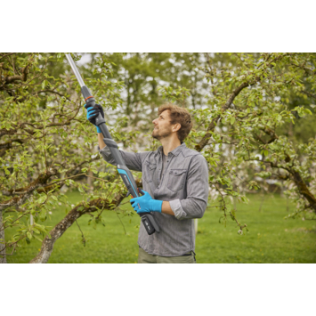 De Accu-telescooptakkenschaar HighCut 360/18V P4A gebruiksklare set van GARDENA helpt je gemakkelijk op grote hoogten te snoeien vanaf de grond. De takkenschaar heeft een maximale lengte van 2,5 meter, waardoor je in totaal wel 4 meter hoog kan snoeien. Dankzij de afneembare steel is de HighCut gemakkelijk te vervoeren en bewaren. De POWER FOR ALL-accu zorgt voor gemakkelijk snoeien zonder dat je veel kracht hoeft te zetten. De originele GARDENA-messen zijn gemaakt in Duitsland van gehard staal en zorgen voor een nette snede in vers hout tot wel 28 mm in diameter. Ze hebben een antikleeflaag en zijn precisiegeslepen, zodat geknipt materiaal niet aan het mes blijft plakken. Gebruik de kantelende en smalle schaarkop om afzonderlijke takken te knippen, met een hoek van 60 graden. De gekantelde kop geeft je bovendien een goed zicht op wat je aan het snoeien bent. Als takken blijven hangen in de boom kan je ze gemakkelijk omlaag trekken, met de haak bovenop het handvat. De ledindicator in de ergonomische handgreep toont je de laadstatus van de accu. Een volle accu met 2,0 Ah maakt tot wel 400 sneden mogelijk. De GARDENA Accu-telescooptakkenschaar HighCut 360/18V P4A wordt geleverd als gebruiksklare set met een snellader en krachtige 18V POWER FOR ALL-accu. De POWER FOR ALL ALLIANCE is een van de grootste merkoverschrijdende accu-allianties van toonaangevende fabrikanten, wier accu's je kan gebruiken in talrijke apparaten in huis en tuin. Zo bespaar je geld maar blijf je toch flexibel! Na een eenvoudige online registratie geeft GARDENA een fabrieksgarantie van 3 jaar op de Accu-telescooptakkenschaar. Passion powered by GARDENA. EEN accusysteem voor alle taken in je tuin.