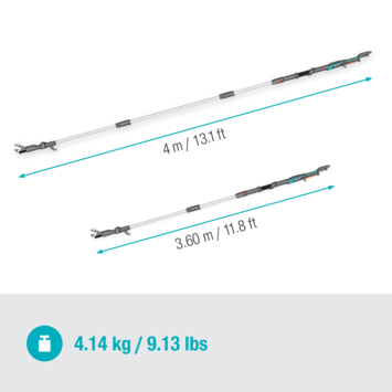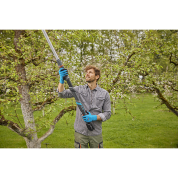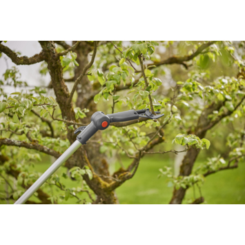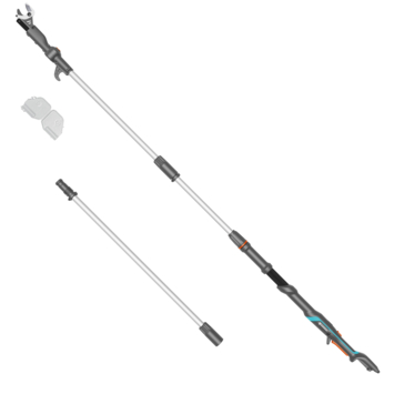 Met de Accu Telescopische Takkenschaar HighCut 360/18V P4A solo van GARDENA snoeit u eenvoudig vanaf de grond tot zeer grote hoogte. Dankzij de geïntegreerde verlengbuis hebben de snoeischaren een lengte tot 3,6m, waardoor u tijdens het snoeien een totale hoogte van maximaal 5m bereikt. Door de praktische telescopische functie kunt u zich flexibel aanpassen aan de omstandigheden. Dankzij de afneembare schacht kunt u de HighCut comfortabel vervoeren en opbergen. De POWER FOR ALL-accu zorgt ervoor dat het knippen gemakkelijk gaat zonder dat er veel stroom nodig is. De originele GARDENA-messen van gehard staal zijn gemaakt in Duitsland en zorgen voor een schone, gladde snede in vers hout tot een diameter van 28mm. Ze zijn voorzien van een anti-aanbaklaag en nauwkeurig geslepen, zodat de stekken niet aan het mes blijven plakken. Gebruik de draaibare en slanke snijkop om losse takken in een hoek van 60 graden te snoeien. Daarnaast geeft de schuine kop u goed zicht op de actie. Mochten er toch takken in de boom blijven haken, dan trekt u ze eenvoudig naar beneden met de trekhaak aan de bovenkant van het handvat. De led-indicator in de ergonomische handgreep geeft de laadstatus van de accu weer. De GARDENA Accu Telescopische Takkenschaar HighCut 360/18V P4A solo wordt geleverd zonder snellader en krachtige 18V POWER FOR ALL accu. Elke batterij van het POWER FOR ALL-batterijsysteem kan worden gebruikt. De POWER FOR ALL ALLIANCE is een van de grootste merkoverschrijdende accu-allianties van toonaangevende fabrikanten, waarvan de accu's in tal van apparaten voor tuin en huis kunnen worden gebruikt. Zo bespaart u geld en blijft u toch flexibel! U kunt de telescopische snoeischaar in combinatie met de accu kopen als gebruiksklare set (art.nr. 14776-20). Na een eenvoudige online registratie biedt GARDENA een fabrieksgarantie van 3 jaar op de telescopische accu-snoeischaar. Passie aangedreven door GARDENA. ÉÉN accusysteem voor alle taken in uw tuin.