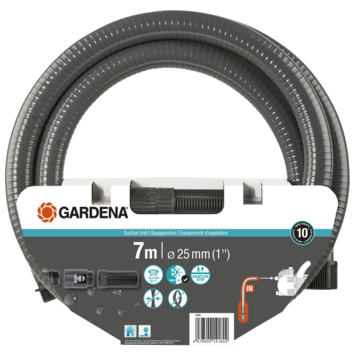 Het Gardena aanzuiggarnituur 7m is een luchtdichte spiraalslang.De slang is uitgerust met een aanzuigfilter en terugslagklep om het water uit uw pomp niet weg te laten zakken als deze afslaat. Deze slang is geschikt voor pompen met een buitendraad van 33,3mm.