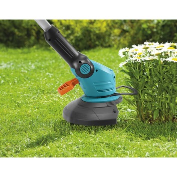 De lichtgewicht Gardena accu grastrimmer EasyCut Li-18/23 R, die zeer eenvoudig te bedienen is, is vooral geschikt voor het trimmen van lange graskanten en moeilijk bereikbare plaatsen. De verwisselbare Lithium-Ion 18V accu is bijzonder krachtig en levert sterke en langdurige snijprestaties. Het gebruikte RotorCut System zorgt voor nauwkeurige snijresultaten bij een bijzonder laag geluidsniveau. De extra lange en eenvoudig verstelbare extra handgreep zorgt voor een comfortabele en ergonomisch geoptimaliseerde werkhouding. De telescopische steel kan worden aangepast aan uw lichaamslengte voor meer comfort bij het werken. De schuin te verstellen steel maakt het werken op moeilijk toegankelijke plaatsen gemakkelijker, bijvoorbeeld onder een trampoline of een tuinbankje. Bij het trimmen dicht langs borders en bloemperken, kan de plantbeschermbeugel worden uitgeklapt om uw planten te beschermen. Dankzij de veiligheidsschakelaar, is de Accu Trimmer beschermd tegen onbedoeld inschakelen. De trimmer is volledig uitgerust met een accu -pack, een acculader, een magazijn voor reservemessen en 20 reservemesjes. Er is geen gereedschap nodig voor de eerste montage. De snijdiameter bedraagt 23 cm. Met een vermogen van 18 V / 2,0 Ah van de Lithium-Ion accu, kan een bedrijfstijd van maximaal 50 minuten worden bereikt. Dit is voldoende voor ca. 1250 m graskant. De POWERinfo laadstatus indicator op de accu geeft aan wanneer deze moet worden opgeladen. Een lege batterij kan volledig worden opgeladen binnen ca. 3 uur. Voor deze trimmer is een losse reserve spoel te bestellen. Dit is de Gardena reservespoel Easy cut 400.