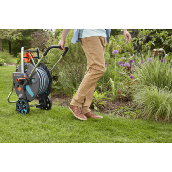 De Gardena slangenwagen AquaRoll L Easy set bespaart je ruimte én is simpel te gebruiken. Het oprollen van de slang gaat eenvoudig door de ergonomische hendel aan de zijkant van de slangenwagen. Na gebruik kan je spuitkop van de tuinslang eenvoudig vastmaken door hem vast te zetten met de clip aan de bovenkant van de AquaRoll L Easy. Je kan tot wel 50 meter aan tuinslang opbergen met de Aquaroll L van Gardena. De set wordt geleverd inclusief tuinslang. De slangenwagen is ook verkrijgbaar in de kleinere maten S en M.