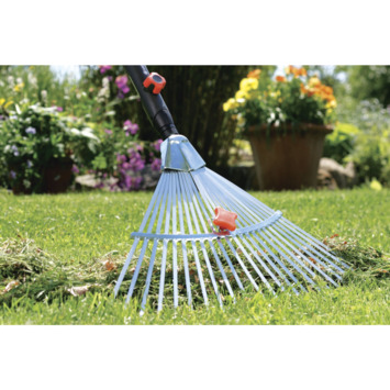 De Gardena bladhark combisystem 30-50cm is een verstelbare bladhark om uw tuin snel weer opgeruimd te krijgen. Met zijn eenvoudig in breedte te verstellen hark kunt u zowel fijn als grof afval bij elkaar harken. De 22 platte verenstalen tanden zorgen ervoor dat u aan deze hark jarenlang een handige tuinhulp heeft. Combineer deze bladhark met de combisystem-steel 130cm voor optimaal gemak.