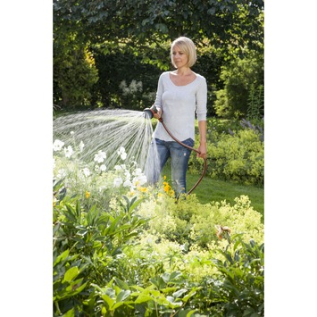 De kop heeft aangesloten op een normale tuinslang weinig waterdruk, en spuit daarom niet zo ver. Verder voelt het wel stevig aan.