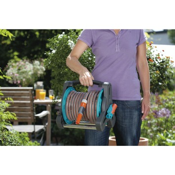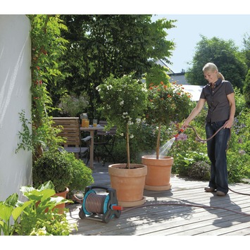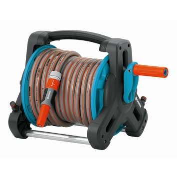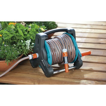 Gardena Classic slangenhouder 8010 kunststof blauw met grijs heeft een 10m lange slang en is geschikt voor in de kleinere tuin of op het terras. Door zijn compacte houder kunt u de slang makkelijk verplaatsen of zelfs opbergen. Bovendien maakt de 3-punts zijkantverbinding de houder zeer stabiel. Op de houder zit een knikvaste 13mm slang met OGS onderdelen gemonteerd. Deze nog geen 3kg wegende houder laat u mobiel tuinieren.