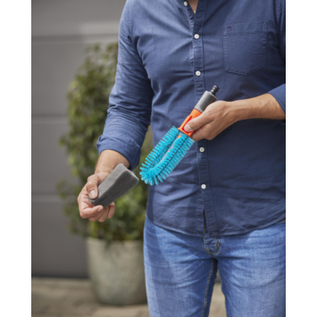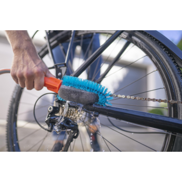 Een borstel met wateraansluiting voor de fiets. Intuïtieve bediening en eenvoudige bediening. De turquoise gekleurde borstelharen worden gebruikt om grof en hardnekkig vuil van het fietsframe te verwijderen, terwijl de spons bijzonder geschikt is voor het reinigen van de gevoeligere onderdelen, zoals de spaken. De wigvorm van de spons zorgt ervoor dat de fietsspaken ideaal bereikt en gereinigd kunnen worden. De spons (art. 18849) kan indien nodig worden vervangen.