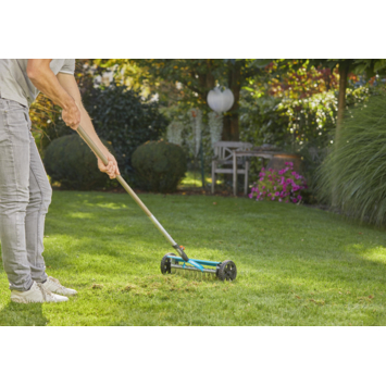 Verwijder snel mos, vilt en onkruid met deze verticuteerhark uit het Gardena combisystem. Ideaal tijdens het voor- of najaar wanneer je het gazon intensief wilt aanpakken. De speciale tanden van roestvrij veerstaal dringen een paar millimeter de bodem in en halen ongewenste resten los zonder schade aan het gras. Zo verbeter je de opname van lucht, water en voedingsstoffen. Dankzij de robuuste wielen met een speciaal loopvlak beweeg je de hark soepel over het gazon. De extra as zorgt voor meer stabiliteit tijdens het gebruik. De werkbreedte van 32 cm maakt het mogelijk om in korte tijd een groot stuk gazon te behandelen. De verticuteerboy is te combineren met alle stelen uit het Gardena combisystem. Voor comfortabel werken wordt een steel van 180 cm aanbevolen. Gemaakt van sterke materialen en ontworpen voor jarenlang gebruik.