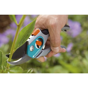 De Gardena Comfort snoeischaar is geschikt voor het snoeien van bloemen, jonge twijgen en jong hout tot een dikte van 20 millimeter. De snoeischaar heeft een zeer smalle en gebogen snoeikop met precisiegeslepen messen met anti-kleefcoating. De snoeischaar heeft een werkpositie voor krachtsnoei en een positie voor snelsnoei. Doordat de openingswijdte van de handgreep verstelbaar is, is de snoeischaar op jouw gewenste stand aan te passen. Met de enkelhandige veiligheidsvergrendeling kun je de snoeischaar eenvoudig vergrendelen. Garantietermijn 25 jaar.