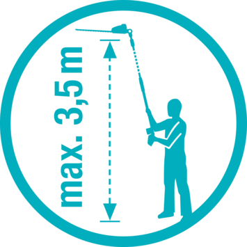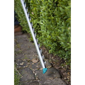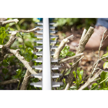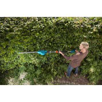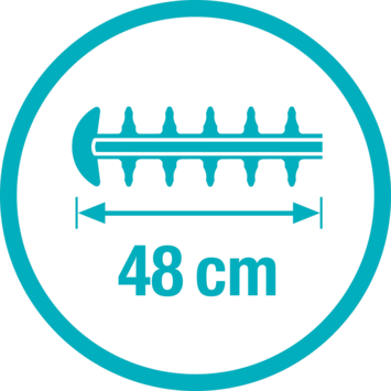 De Gardena elektrische heggenschaar THS 500/48 beschikt over een telescopische steel wat hem ideaal maakt voor het snoeien van hoge heggen vanuit een staande positie op de grond. De telescopische steel kan verlengd worden tot 2 meter voor een bereik van ongeveer 3 meter. Dankzij de kantelbare kop kunnen heggentoppen en bodembedekkers gemakkelijk gesnoeid worden. Dankzij de grote mesopening zijn takken tot 25 mm zijn geen probleem voor deze heggenschaar. De THS 500/48 heggenschaar is voorzien van een krachtige motor van 500 watt voor krachtig en continu snoeien. De meslengte van de Gardena elektrische heggenschaar THS 500/48 is 48 cm.