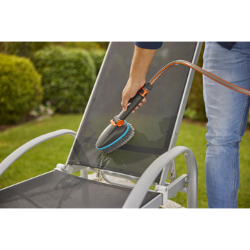 De Gardena handwasborstel kunststof met waterdoorvoer via de original Gardena systeemaansluiting is een borstel met hoogwaardige paardenharen. Om comfort te garanderen kunt u de waterdoorvoer met één hand traploos regelen en afsluiten. Om krassen te voorkomen heeft de borstel een zachte kunststof rand. Vanwege zijn platte houder komt u zelfs in de moeilijk te bereiken plaatsen. Wanneer u Gardena shampoostaafjes wilt bijmengen kan dat bovendien zeer eenvoudig. Een handwasboestel waar u kwetsbare oppervlakten moeiteloos schoon mee krijgt.