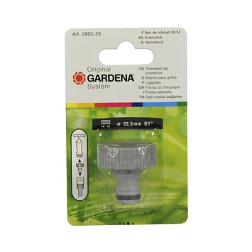 GARDENA kraanstuk 1" De GARDENA System aansluiting op de kraan. Zonder gereedschap te monteren. 26,5 mm (G3/4)-waterkraan met 33,3 mm ( G1")-draad. Op blister