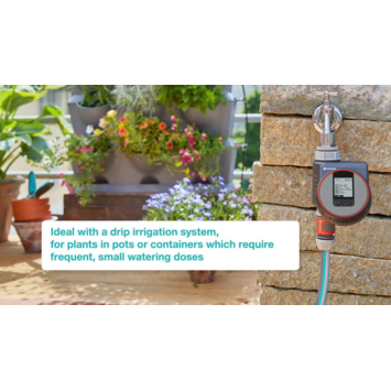 De Gardena besproeiingscomputer Flex Control is bedoelt voor irrigatie op balkons, dakterrassen of patio's. Je sluit het apparaat direct aan op de kraan. De bediening van het apparaat is ook zeer eenvoudig door de roterende knop en de goed leesbare display. Je kan de sproeicycli seconden nauwkeurig instellen, hierdoor kan je de Gardena besproeiingscomputer Flex Control ook gebruiken als druppelsysteem. Het is mogelijk om de computer te combineren met de Gardena bodemvochtigheidssensor.