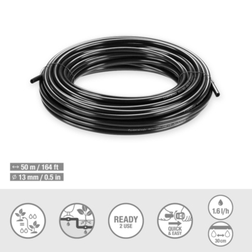 De 50 m lange GARDENA Druppelbuis 1,6 l/u voor bovengrondse en ondergrondse installatie met geïntegreerde Druppelaars is ideaal voor een waterbesparende bewatering van jouw plantenrijen, zoals heggen, struiken en buxussen. De Druppelbuis is geweldig te combineren met een van de twee Micro-Drip-Bewatering Sets Heggen/Struiken (art-nr. 13500-20 en 13501-20) en erg makkelijk te aan te leggen. Je kunt kiezen of je de Druppelbuis liever bovengronds of uit het zicht ondergronds aanlegt. Als u hem ondergronds aanlegt, raakt hij niet verstopt dankzij de speciale Self-Clean-functie met labyrinttechnologie en wortelscherm. Iedere 30 cm is er een Druppelaar geïntegreerd in de buis, die constant 1,6 liter water per uur vrijgeeft. Zo bewater je de planten gelijkmatig. De Druppelaars zijn drukcompenserend en zijn daarom ook goed bestand tegen hoogteverschillen, bijvoorbeeld op een helling. Het Micro-Drip-System is om te bouwen of uit te breiden met de afzonderlijk verkrijgbare 13 mm koppelingen met gepatenteerde Quick & Easy-koppelingstechnologie. De slimme herbruikbaarheid van de MDS-onderdelen maakt het hele systeem duurzaam. Zelfs na herhaaldelijk gebruik raken ze niet beschadigd. Zo zorg je goed voor jouw planten maar bespaar je toch water. Makkelijk en nauwkeurig bewateren, om water en tijd te besparen.