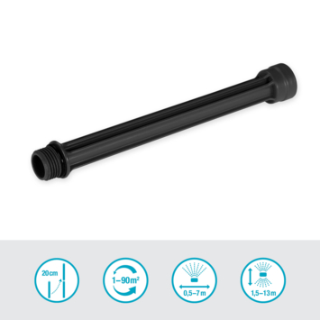 Gebruik de Verlengbuis voor de Zwenksproeier OS 90 van GARDENA om het Micro-Drip-System aan te passen op de groei van je planten. De buis ondersteunt je optimaal bij het bewateren van plant- en bloemperken en verhoogt de sproeier met 20 cm tot maximaal 40 cm, om hoge en groeiende planten gelijkmatig te bewateren. De montage gaat snel en gemakkelijk. Je plaatst de Verlengbuis eenvoudig tussen de sproeikop en de sproeiervoet. De Zwenksproeier OS 90 (art. nr. 13325-20) bewatert een oppervlak tussen 1 en 90 m². Je kan de sproeiafstand van de sproeier flexibel reguleren tussen 1,5 en 13 m, het sproeigebied afstellen tussen 0,5 m en maximaal 7 m en zelfs de waterstroom aanpassen om je tuin optimaal te bewateren. Micro-Drip-System. Zo zorg je goed voor je planten maar bespaar je toch water. Makkelijk en nauwkeurig bewateren, om water en tijd te besparen.