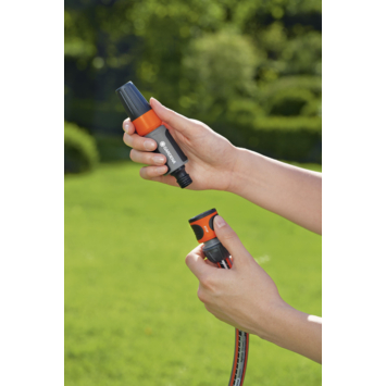 De Gardena System tuinspuitset bevat een waterstop en een Gardena tuinspuit . Dankzij de waterstop stop de watertoevoer automatisch als de spuit wordt afgekoppeld en stroomt het water weer als een besproeiingsaccessoire wordt vastgekoppeld. Je hoeft tijdens het wisselen van besproeiingsaccessoires niet naar de kraan te lopen om deze dicht te draaien. De waterstop is geschikt voor 13 mm (1/2") en 15 mm (5/8”) slangen.