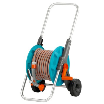 De Gardena slangwagen met slang 20m wordt compleet met broes en aansluitgarnituur geleverd. Doordat de slangaansluiting afgerond is knikt de slang hier niet. Om meedraaien van de aansluiting bij het af- en oprollen te voorkomen is de aansluitas bovendien gelagerd. De druppelstop voorkomt weglopen van water na gebruik van de slang en doordat de pistoolbroes een softgrip handvat heeft, ligt deze prettig in de hand. Tevens is de impulsknop op de broes vast te zetten voor nog meer comfort. Een uitstekende slangwagen met bewegingsvrijheid.