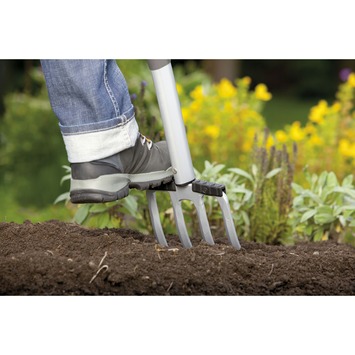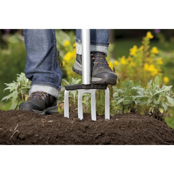 De Gardena Terraline™ spitvork is een waardevolle hulp voor het omzetten van de grond, vooral in beplante oppervlakken. De extra brede en ergonomisch gevormde T-handgreep met zachte kunststof componenten is bijzonder comfortabel voor het vasthouden van beide handen. Spitten gaat veel gemakkelijker. Een extra brede voetsteun met beschermde robuuste loopvlak zorgt voor een goede toepassing van kracht en vermindert het gevaar van letsel door het onbedoeld wegglijden. Een ander pluspunt van de Terraline™ spitvork is de Softec™ demping die de gewrichten ontzien, aangemeld voor patent. Terugslag tijdens het graven wordt verminderd, bijv. bij het botsen op een steen of tijdens het afsteken van dikke wortels. De vorm van de steel is ook ideaal: de druppelvormige steelprofiel zorgt ervoor dat het handvat goed in de hand ligt en voorkomt onbedoeld verdraaien. De met kunststof beklede steel ligt prettig en stevig in de hand. De optimale hoek van de handgreep naar het blad staat ook garant voor ergonomisch te werken. Het blad van de spade is gemaakt van robuust, gehard kwaliteit staal met hoogwaardige coating. De totale lengte van de spade is 117 cm. Hoge kwaliteit betekent een lange levensduur. Gardena geeft 25 jaar garantie!