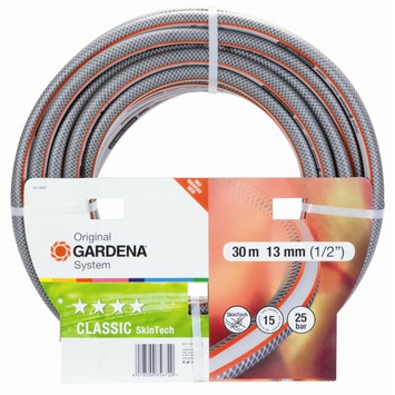 GARDENA Classic SkinTech-slang 13 mm (1/2") - 30 meter Met SkinTech-laag en hoogwaardig weefsel. Vormvast, knikt en verdraait niet, glijdt soepel langs obstakels. Hoge wandsterkte voor veiligheid en lange levensduur. Voor middelmatig gebruik. Barstdruk 25 bar. Garantie 15 jaar. 4-kleuren displayschijf