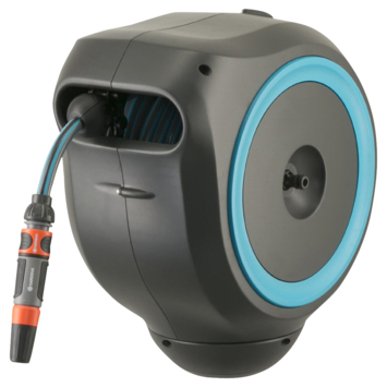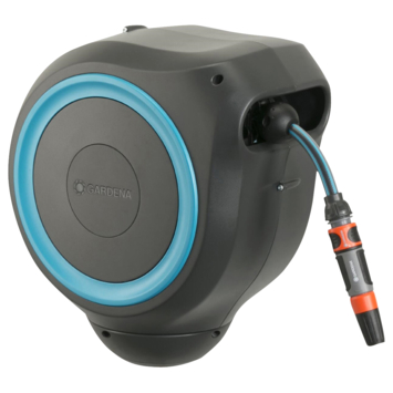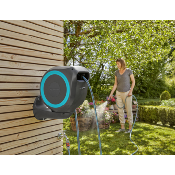 Deze Gardena wandslangenbox roll-up automatic met een 15 meter lange slang, is een uitkomst voor terrassen en kleinere tuinen. Wanneer je na gebruik een korte ruk aan de slang geeft, rolt deze automatisch veilig en gelijkmatig op. De wandhouder geeft de box een 180 graden bereik dankzij het stevige scharnier. Om je Gardena hulpstukken te kunnen opbergen gebruik je de praktische geïntegreerde houder en om het geheel makkelijk mee te kunnen nemen is de box voorzien van een draaggreep. Om na gebruik geen water weg te laten lopen, heeft de wandslangenbox een druppelstop. De 15 meter 11 mm slang en 1.5 meter aansluitslang laten je met gemak alle hoeken van uw tuin of terras bewateren.