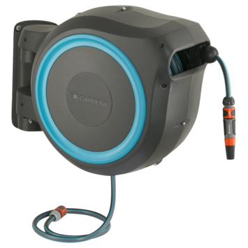 De Gardena wandslangenbox roll-up automatic slang 35m laat u comfortabel en eenvoudig besproeien. Na gebruik is een korte ruk genoeg om de slang zichzelf weer op te laten rollen. Bovendien is de wandslangenbox roll-up uitgerust met een geïntegreerde slanggeleider, wat het verdraaien of verstrengelen van de slang voorkomt. De 13mm dikke slang stopt bij uittrekken met korte intervallen van 50cm. En door de hoge waterdoorstroom werkt de sproeier optimaal. Na gebruik plaatst u de aansluitslang op de druppelstop om het weglekken van water te voorkomen. Wilt u de box opbergen? Dan tilt u hem aan de ergonomisch gevormde handgreep eenvoudig uit de beugel. Naast de slang van 35 meter vindt u ook een 1.5 meter lange aansluitslang, traploos verstelbare tuinspuit en de benodigde original Gardena system onderdelen in de doos. Wanneer u deze wandslangenbox heeft opgehangen met de meegeleverde schroeven en pluggen ervaart u zijn 180 graden draaibare vrijheid. Inclusief wandhouder.