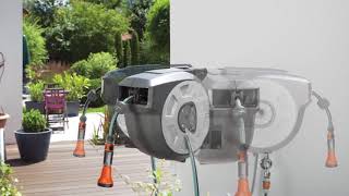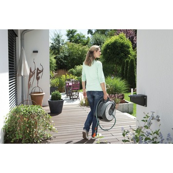 De Gardena Comfort wandslangenbox 15 roll-up automatic maakt besproeien bijzonder eenvoudig en comfortabel. De slang wordt automatisch opgerold. De praktische slangenbox wordt aan de muur bevestigd en is 180 ° zwenkbaar. De slang kan met weinig inspanning worden uitgetrokken en gestopt met korte tussenpozen van maximaal 50 cm. De kwaliteitsslang van 13 mm (½'') levert een hoge waterdoorstroom en optimale werking van de sproeier. Met een korte ruk aan de slang, wordt de vergrendeling opgeheven en wordt de slang door de roll-up automatisch de box ingetrokken zonder dat u hier verder iets voor hoeft te doen. Uw handen blijven schoon. Een geïntegreerde stalen veer perfect op de slanglengte afgestemd, zorgt voor een krachtige, gelijkmatige slangretractie. De geïntegreerde slanggeleider voorkomt verdraaien en verstrengeling van de slang. Na gebruik kan de aansluitslang eenvoudig op de druppelstop bevestigd worden om weglopen van water te voorkomen. Broezen, sproeiers en wasborstels kunnen worden opgehangen aan de wandhouder zodat ze altijd onder handbereik zijn. Voor de winter kan de slangenbox eenvoudig met de ergonomisch gevormde handgreep van de houder afgehaald worden voor opslag in een vorstvrije ruimte. De wandslangenbox is compleet uitgerust met een 15-meter lange kwaliteitsslang, een 1,5 meter lange aansluitslang, een traploos verstelbare tuinspuit (art. nr. 8114) en de benodigde Original GARDENA System onderdelen: drie slangstukken (art.nr. 900, 901, 902), een standaard slangkoppeling (art. nr. 915) en een waterstop (art.nr. 913). Dankzij de meegeleverde wandhouder, samen met schroeven en pluggen, is de montage een fluitje van een cent. Besproeien is heel eenvoudig - met de Comfort wandslangenbox 15 roll-up automatisch.