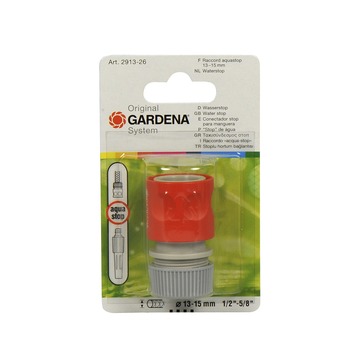 GARDENA waterstop 1/2" Dit slangstuk maakt het omwisselen van GARDENA gereedschap bij geopende kraan mogelijk zonder waterverlies. Ontkoppelen: watertoevoer stopt. Koppelen: watertoevoer vrij. Voor 13 mm (1/2")-slangen, op blister.