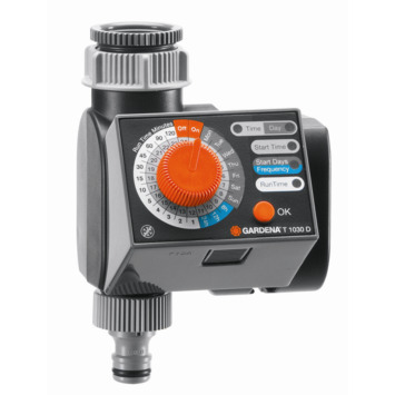 GARDENA watertimer T 1030 Classic model met max. 3 besproeiingen per dag. Besproeiingsduur van 1 – 180 minuten. Werkt ca. 1 jaar met 1 x 9 V Alkaline batterij (niet inbegrepen). Zwakke batterij wordt weergegeven. 4-kleuren geschenkverpakking.