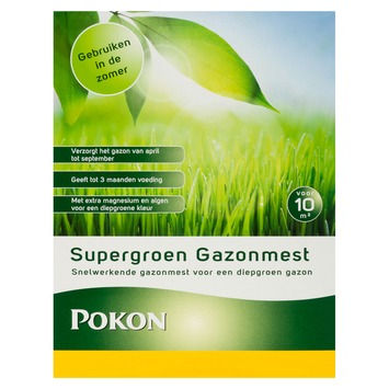 Pokon supergroen gazonmest is een hoogwaardige organisch-minerale gazonmeststof met hoog stikstofgehalte en extra magnesium en algen voor het groenste gazon van de straat. Bevordert de groei van het gazon gedurende de hele groeiperiode van gazon van april tot september gedurende een periode tot 3 maanden. De samenstelling is NPK 14+4+8+2 Mg0. Een verpakking van 1kg is voldoende voor 10m2 gazon. Tip: gebruik Pokon Supergroen gazonmest samen met de Gazonmest Plus Kalk in het voor- en najaar en maai het gras niet te kort. Dan krijgt u met het grootste gemak het groenste gazon.