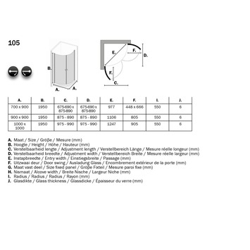 Deze cabine heeft een verstelbaarheid buitenzijde profiel van 97,5 tot en met 99 cm.