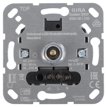 LV-dimmer met druk-wisselschakelaar van Gira ST55 en potentiometer voor instelling van de basislichtsterkte. Geschikt voor dimmen van HV-LED-lampen en spaarlampen (3-60Watt), gloeilampen en HV-halogeenlampen (20-210Watt) en inductieve trafo s met halogeenlampen met ten minste 85% nominale belasting (20-210VA).